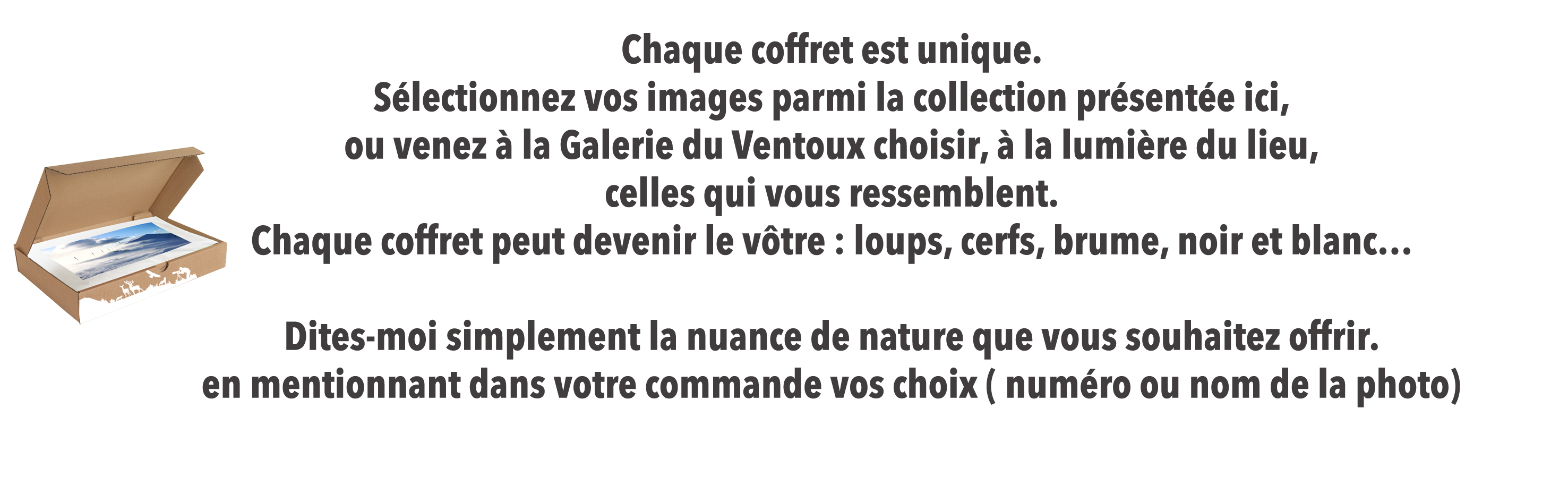 Mais si votre coup de cœur se trouve ailleurs — à la Galerie du Ventoux à Sault ou sur l’une des pages de mon site — il est toujours possible de l’inclure dans votre coffret.